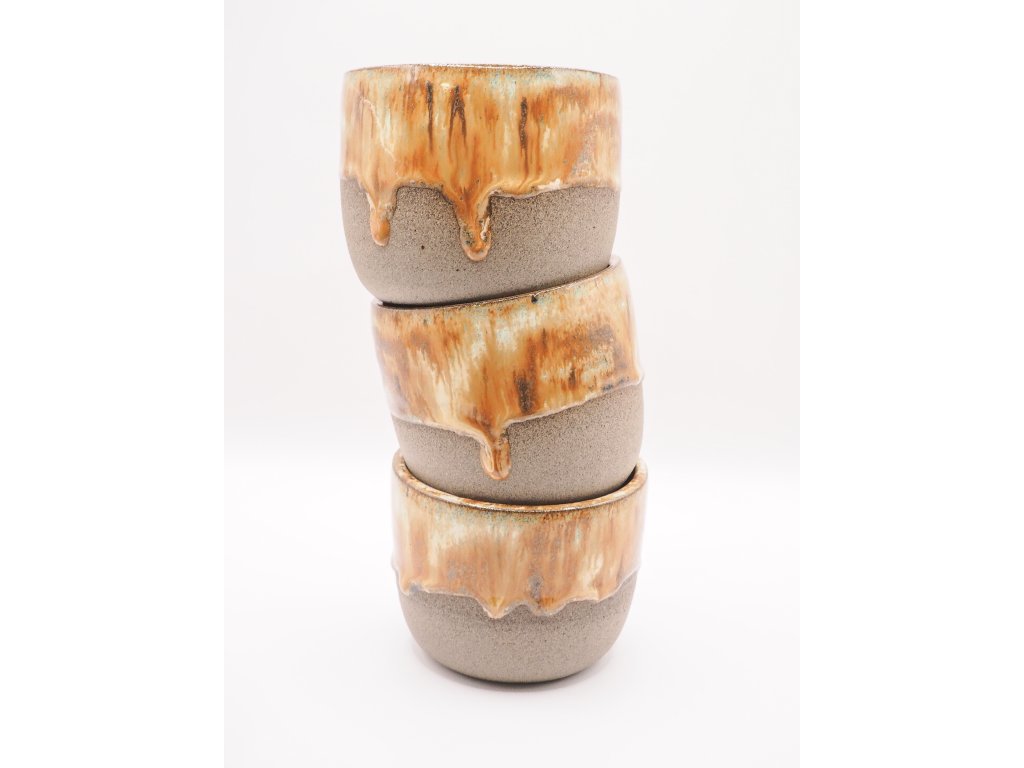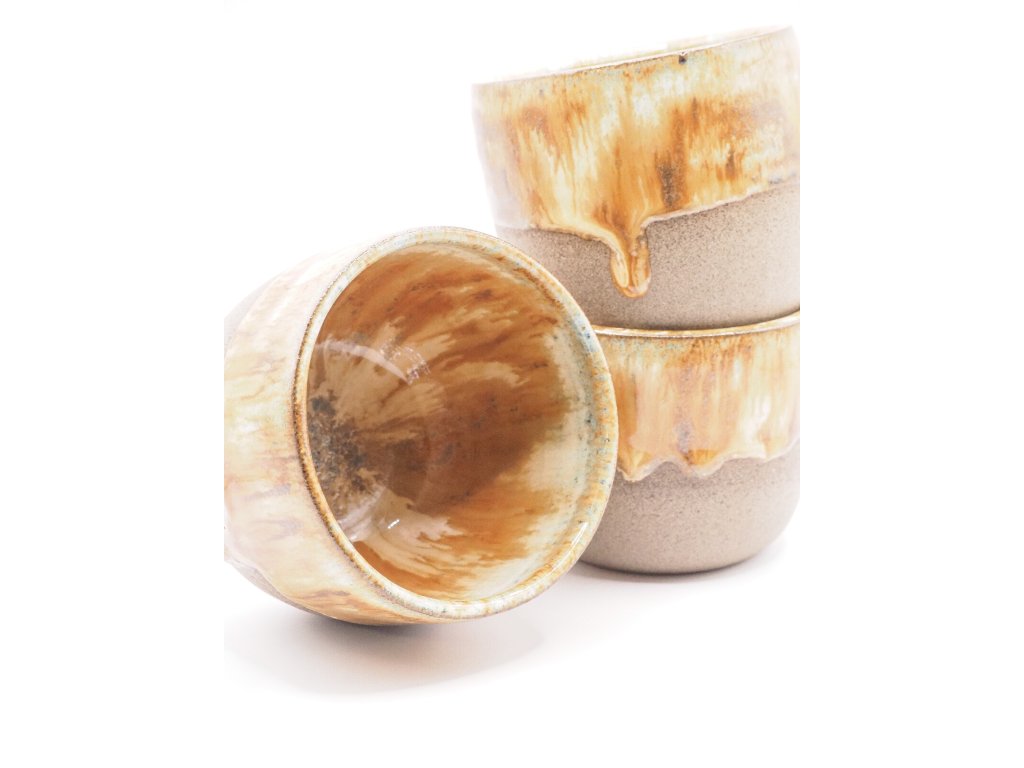 Kalíšek v karamelové barvě na šedivé kamenině byl volně vytočen na hrnčířském kruhu a následně dvakrát vypálen při vysokých teplotách v elektrické peci na keramiku. Díky vysokoteplotnímu výpalu je vhodný i do myčky nádobí, avšak pro zachování jeho lesku a dlouhé životnosti doporučuji raději ruční mytí.