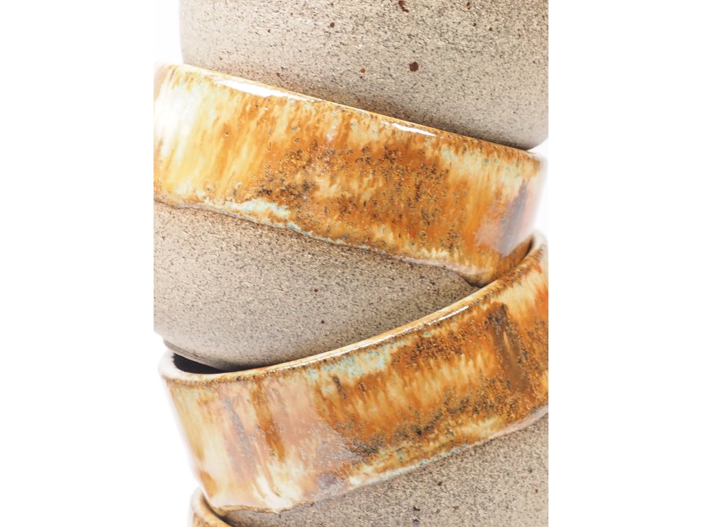 Kalíšek v karamelové barvě na šedobéžové kamenině byl volně vytočen na hrnčířském kruhu a následně dvakrát vypálen při vysokých teplotách v elektrické peci na keramiku. Díky vysokoteplotnímu výpalu je vhodný i do myčky nádobí, avšak pro zachování jeho lesku a dlouhé životnosti doporučuji raději ruční mytí.