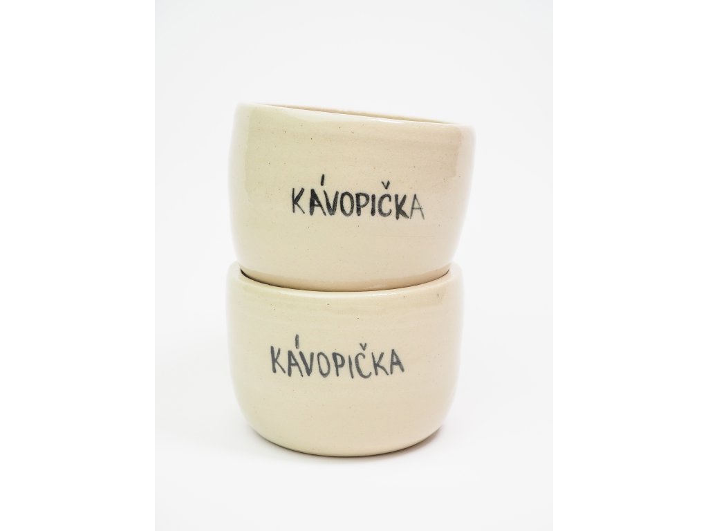 Kalíšek s nápisem "KÁVOPIČKA" na bílé kamenině byl volně vytočen na hrnčířském kruhu a následně dvakrát vypálen při vysokých teplotách v elektrické peci na keramiku. Díky vysokoteplotnímu výpalu je vhodný i do myčky nádobí, avšak pro zachování jeho lesku a dlouhé životnosti doporučuji raději ruční mytí.