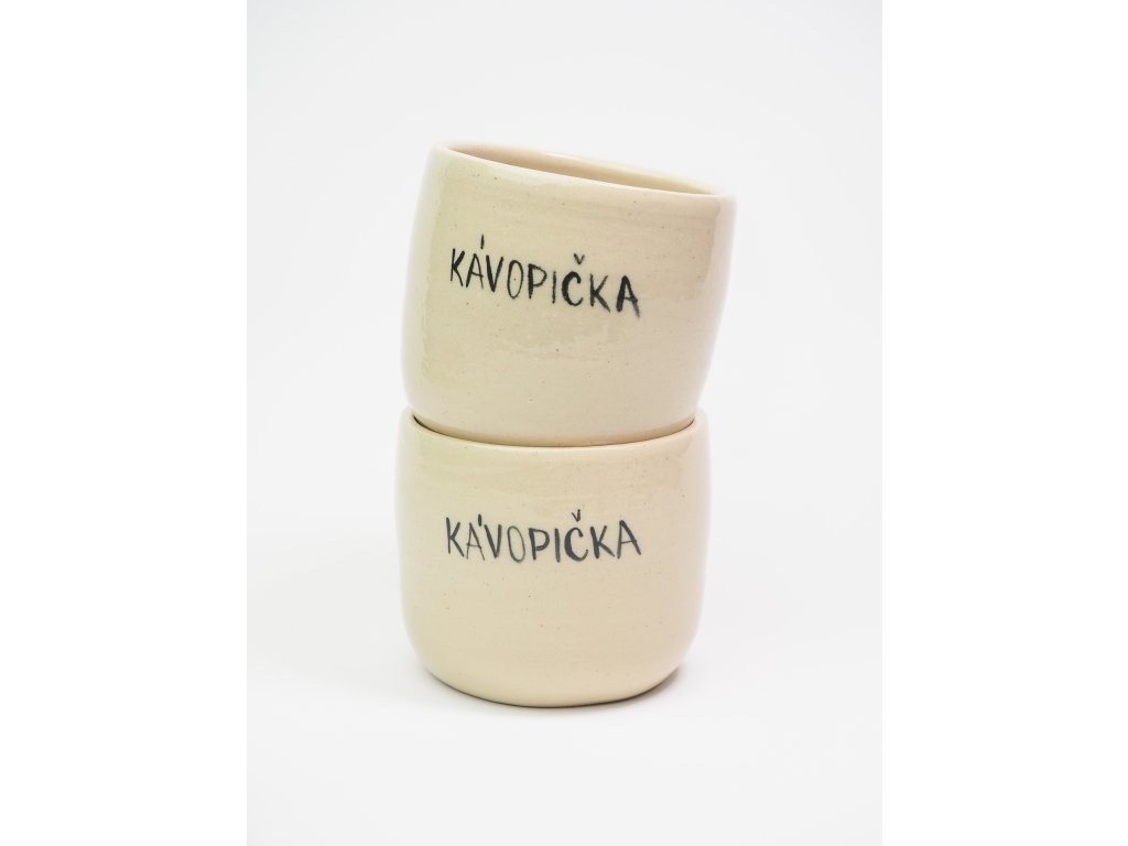 Kalíšek s nápisem "KÁVOPIČKA" na bílé kamenině byl volně vytočen na hrnčířském kruhu a následně dvakrát vypálen při vysokých teplotách v elektrické peci na keramiku. Díky vysokoteplotnímu výpalu je vhodný i do myčky nádobí, avšak pro zachování jeho lesku a dlouhé životnosti doporučuji raději ruční mytí.