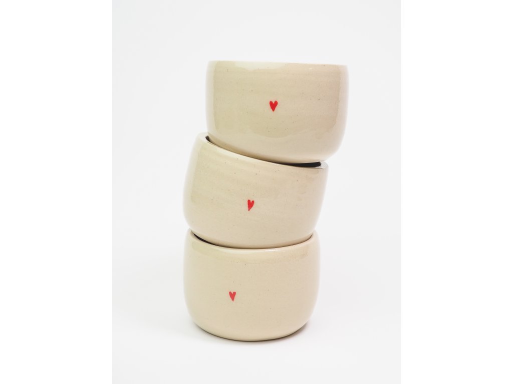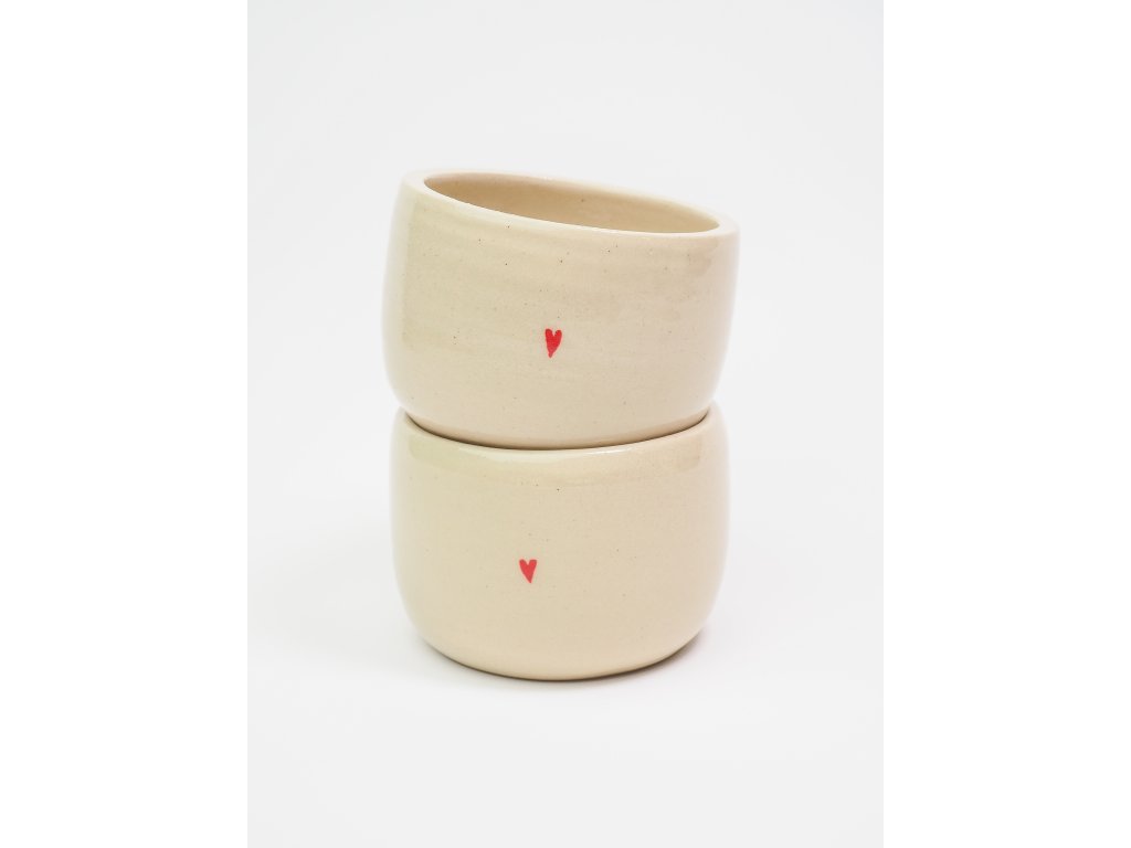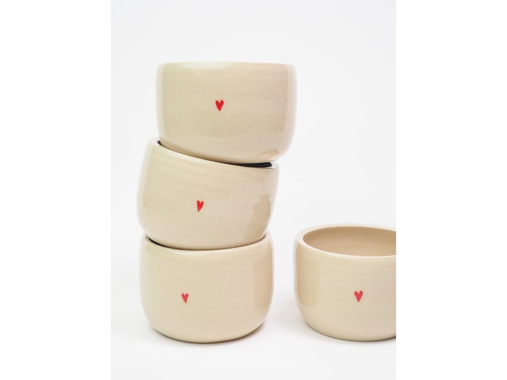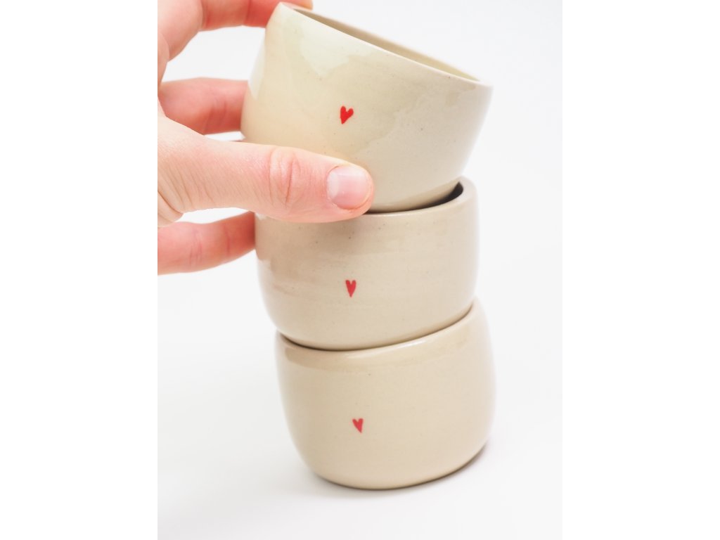 Kalíšek s červeným srdcem na bílé kamenině byl volně vytočen na hrnčířském kruhu a následně dvakrát vypálen při vysokých teplotách v elektrické peci na keramiku. Díky vysokoteplotnímu výpalu je vhodný i do myčky nádobí, avšak pro zachování jeho lesku a dlouhé životnosti doporučuji raději ruční mytí.