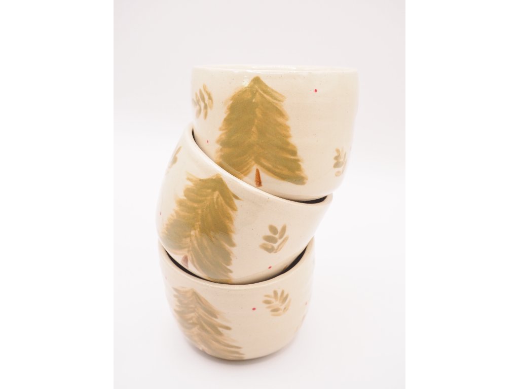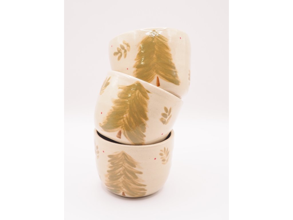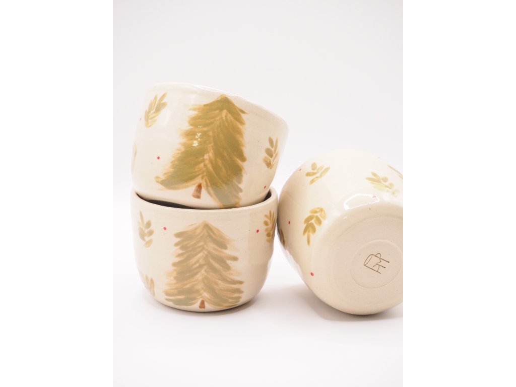 Kalíšek s ručně malovaným stromečkem na bílé kamenině byl volně vytočen na hrnčířském kruhu a následně dvakrát vypálen při vysokých teplotách v elektrické peci na keramiku. Díky vysokoteplotnímu výpalu je vhodný i do myčky nádobí, avšak pro zachování jeho lesku a dlouhé životnosti doporučuji raději ruční mytí.