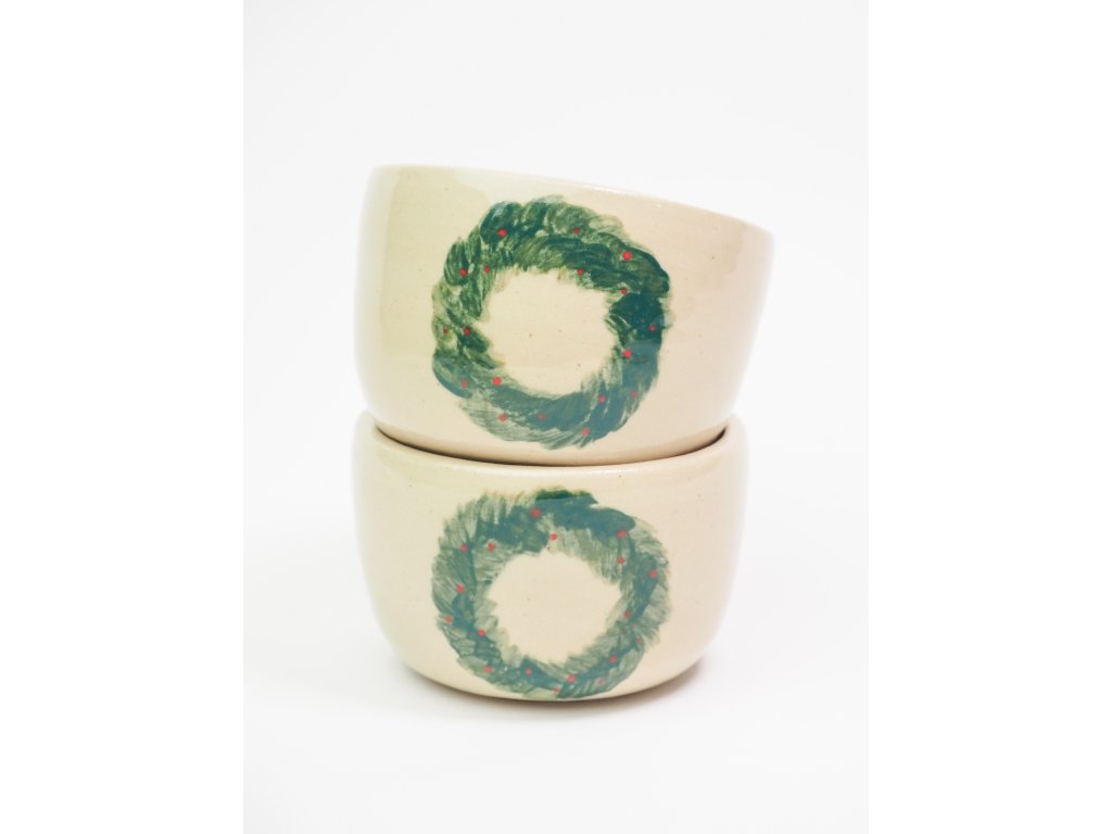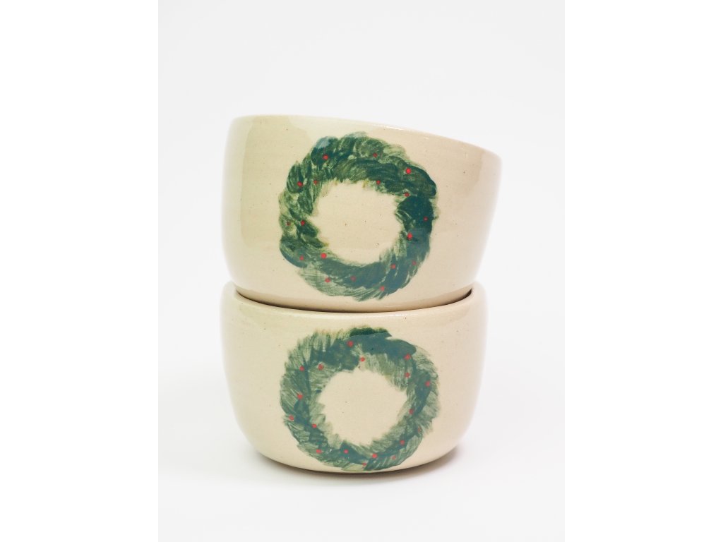 Kalíšek s ručně malovaným věncem na bílé kamenině byl volně vytočen na hrnčířském kruhu a následně dvakrát vypálen při vysokých teplotách v elektrické peci na keramiku. Díky vysokoteplotnímu výpalu je vhodný i do myčky nádobí, avšak pro zachování jeho lesku a dlouhé životnosti doporučuji raději ruční mytí.